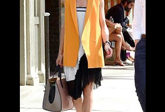 Este look seguramente que algunos lo recordaréis porque se hizo muy famoso al utilizar esta falda plisada en blanco y negro de Zara como vestido. Quizás Amancio Ortega quiso aprovechar esa fama que le creó el look para poner a la venta esta temporada un chaleco naranja como el que Olivia Palermo lució ese día.