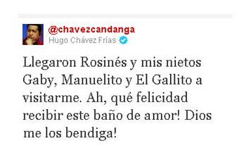 “Llegaron Rosinés y mis nietos Gaby, Manuelito y El Gallito a visitarme. Ah, qué felicidad recibir este baño de amor! Dios me los bendiga!”, dijo Chávez a través de su cuenta en la red social Twitter.