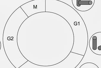 Figura CC-01. El ciclo del centrosoma, versión resumida. El centrosoma es un orgánulo que debe reproducirse igual que una célula, su división total se da entre la fase de síntesis y la segunda fase de crecimiento o G2.