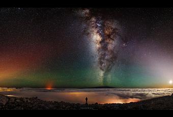 ¿Como sería encontrarse en la cima de un volcán y contemplar todo el Universo? Si el momento es el adecuado, podría ver un formidable panorama como este. Aquí el volcán es el Mauna Kea , y el momento una noche clara del verano pasado. En primer plano de esta panorámica orientada al sur hay un agreste paisaje salpicado de rocas y de plantas resistentes . Un poco más arriba y más lejos, una manta blanca de nubes se extiende por el horizonte y parece dividir el cielo y la Tierra. Las luces de la ciudad iluminan las nubes y el cielo en el extremo izquierdo, mientras la lava de color naranja de la caldera volcánica del Kilauea ilumina las nubes a la izquierda del centro. La cumbre de un volcán hawaiano aún más distante, el Mauna Loa , se ve perfilada cerca del horizonte central. Por encima de las nubes se ve la luminiscencia atmosférica verde causada por las moléculas de aire excitadas por el Sol durante el día. La Luna es el astro brillante que hay a la derecha. Más a la derecha se extiende una banda difusa de luz zodiacal de color claro. Más lejos, la parte central de la Vía Láctea parece elevarse verticalmente desde el Mauna Loa. La persona que presenció y captó esta impresionante panorámica está el centro de la imagen.