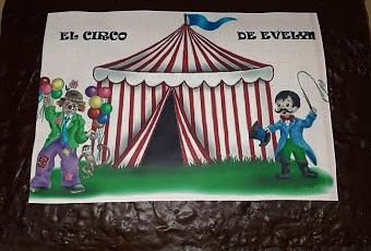 Mañana es el santo de mi hija pequeña, Evelyn, y lo celebraremos en casa con la familia, pero hoy, en el cole, ha comenzado la celebración. Evelyn ha llevado un bizcocho para desayunar con sus compis y profes... un bizcocho de "El circo de Evelyn", gracias al tato Carlos que nos hizo este simpático dibujo en azúcar.