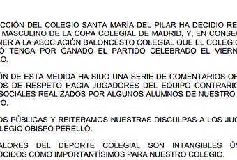 Mediante un comunicado remitido a la Asociación de Baloncesto Colegial, entidad organizadora de la Copa Colegial en Madrid, la Dirección del Colegio Santa María del Pilar ha decidido retirar al equipo masculino de la Copa Colegial 2017.La razón, como reza dicho comunicado , reside una serie de comentarios ofensivos y faltos de respeto hacia jugadores del equipo contrario en las redes sociales realizados por alumnos de dicho centro y jugadores de dicho equipo, tras el doble duelo ante Obispo Perelló del pasado 3 de febrero.Desde Santa Maria del Pilar, piden disculpas tanto a los jugadores como al colegio rival y conceden la victoria a Obispo Perelló, que ha declinado seguir en el cuadro.Por todo ello, en el siguiente partido programado en categoría, SMP vs Pilaristas, se da como ganador a Pilaristas por 0-2.Desde la propia ABC y la Fundación Baloncesto Colegial queremos manifestar nuestro total apoyo y satisfacción con la decisión tomada por el Colegio Santa María del Pilar, que pone de manifiesto su compromiso con los valores del baloncesto colegial y cómo son parte irrenunciable del mismo. De la misma forma queremos también destacar y valorar la actitud y proceder del Colegio Obispo Perellóhttp://copacolegial.com/madrid