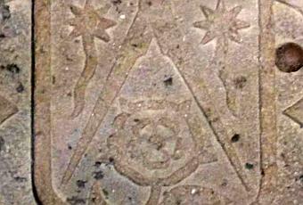 El escudo tiene un compás, dos cometas y una rosa: motivos geométricos y astronómicos. Uno de los compases está en la losa sepulcral del suelo en bajorrelieve y hay otro pintado sobre los doradod del retablo del taller de Jaume Huguet.