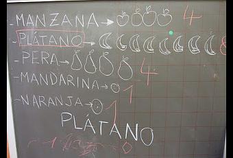 Después, contamos cuántas frutas hay de cada tipo y vemos de cuál hay más. Esa fruta es la ganadora de ese día y algún niño que la haya traido y ya se la haya comido, sale a la pizarra a escribir el nombre de dicho alimento.