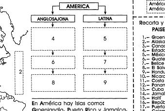 -Recorta los recuadros de la derecha y pégalos para poner los límites de América y completar el mapa conceptual.