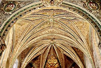 Como decíamos ayer, la zona del presbiterio está ligeramente elevada respecto al resto de la nave del templo y separada de ésta por un arco triunfal con decoración de tipo Jerónimo y sobre la que se apoyan dos ángeles lampareros, uno en cada pilar del arco. Estos ángeles son obras de Bartolomé García de Santiago.
