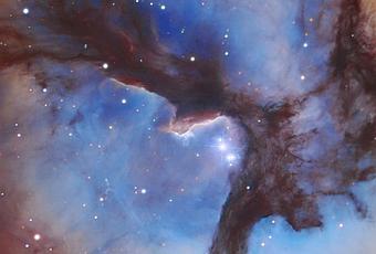 En la nebulosa Trífida, una región de formación estelar que hay en la constelación del Arquero (Sagittarius), las nubes de gas resplandeciente se mezclan con las franjas de polvo. En el centro se juntan las tres franjas de polvo que dan nombre a la nebulosa. A la derecha aparecen montañas de polvo opaca y por toda la nebulosa se ven otros filamentos de polvo oscuro. Cerca del centro hay una única estrella masiva que causa gran parte del brillo de la Trífida. También conocida como M20, la Trífida tiene tan sólo unos 300.000 años de edad, lo que la hace ser una las nebulosas de emisión más jóvenes conocidas. La nebulosa se encuentra a unos 9.000 años luz de distancia; la parte representada aquí abarca unos 10 años luz.