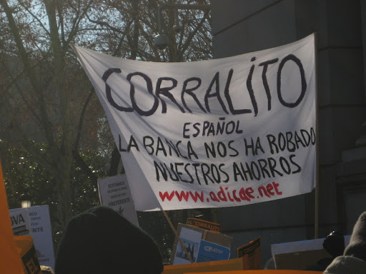 Las llamadas “participaciones preferentes”, una especie de corralito financiero que ha atrapado los ahorros de cerca de un millón de familias españolas, provocaron estragos. Se trataría, según los afectados, de una gran estafa, perfectamente maquinada por los bancos españoles, contra una mayoría de pensionistas y pequeños ahorradores, que creían haber contratado una cuenta de plazo fijo cuando realmente fue un producto financiero de inversión, de carácter perpetuo. Muchos de ellos todavía no lo saben y desde las sucursales bancarias tampoco les informaron correctamente. La mayoría de medios de comunicación no se hicieron eco de la noticia puesto que siguieron a ojos cerrados los consejos y publicidad de la banca y no osó enfrentarse con ella. Pero, quienes confiaron en los bancos, pensando que invertían en renta fija sin riesgos, se encontraron con que no podían disponer de su dinero, con las reglas de los mercados cambiadas, y el banco sin obligación de devolverlo. A los diez años del corralito argentino, medida por la que millones de argentinos vieron bloqueadas sus cuentas corrientes de la noche a la mañana, el fantasma de un corralito español en forma de restricciones a la libre disposición de fondos no era más que un ejercicio teórico de ficción para economistas. Y los ahorradores terminaron por perder la confianza en los bancos.