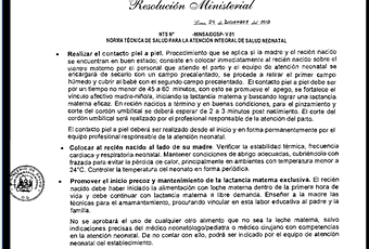 Hace poco, una amiga me envió con mucho cariño esta resolución ministerial, con información super interesante, donde dice, entre otras cosas, que apenas nace el Bebé, debe ponerse en contacto con la piel de la Mamá por un tiempo no menor de 45 a 60 minutos y el corte del cordón umbilical se deberá hacer de 2 a 3 minutos post nacimiento.