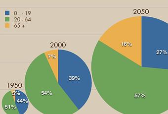 En 1950 en torno a la mitad de la población mundial tenía entre 20 y 64 años —verde—. Conforme esta cifra ha ido aumentando —y se prevé que seguirá haciéndolo—, cada vez es mayor la proporción de personas mayores de 65 años —amarillo— y menor la de menores de 20 años —azul—. Fuente: Study Aids