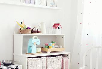 Mueble tipo zapatero de Ikea parecido al Modelo Ikea PS 2012 en blanco, juguetes, cestas de mimbre y balda donde se apoyan los cuadros de Ikea. Cocina de BRIO y mecedora blanca vintage.