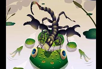 La Rana y el Escorpión llegaron a la rivera de un río al mismo tiempo. Y la Rana se disponía a saltar al río y nadar al otro lado. Viene el Escorpión, ve lo que va a pasar, de modo que se pone a conversar con la Rana.