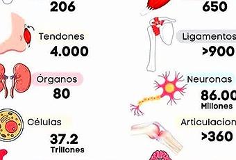 1. Huesos Los huesos son estructuras rígidas que forman el esqueleto del cuerpo. En un adulto humano, hay un total de 206 huesos. Estos huesos proporcionan soporte, protección a los órganos internos y facilitan el movimiento junto con los músculos.2. TendonesLos tendones son tejidos conectivos que unen los músculos a los huesos. Hay aproximadamente 4,000 tendones en el cuerpo humano, y su función principal es transmitir la fuerza generada por los músculos para mover los huesos.3. Órganos El cuerpo humano cuenta con aproximadamente 80 órganos diferentes, cada uno con funciones específicas vitales para la vida. Algunos ejemplos de órganos importantes incluyen el corazón, el hígado, los pulmones y el cerebro.4. Células El cuerpo humano está compuesto por un estimado de 37.2 trillones de células. Estas células son la unidad básica de la vida y realizan diversas funciones especializadas. Hay diferentes tipos de células, como las células sanguíneas, las células nerviosas y las células musculares.5. Vasos Sanguíneos Los vasos sanguíneos incluyen arterias, venas y capilares que suman aproximadamente 96,000 kilómetros en total. Estos vasos transportan sangre rica en oxígeno y nutrientes a todas las partes del cuerpo y recogen los desechos metabólicos.6. MúsculosEl cuerpo humano tiene alrededor de 650 músculos, los cuales son responsables del movimiento y la postura. Los músculos pueden ser voluntarios (como los bíceps) o involuntarios (como el corazón).7. Ligamentos Los ligamentos son tejidos conectivos que unen hueso con hueso en las articulaciones. Hay más de 900 ligamentos en el cuerpo, y su función principal es proporcionar estabilidad a las articulaciones.8. Neuronas El cerebro humano contiene aproximadamente 86,000 millones de neuronas. Las neuronas son células nerviosas que transmiten señales eléctricas y químicas para la comunicación entre diferentes partes del cuerpo y el cerebro.9. Articulaciones Las articulaciones son puntos de unión entre dos o más huesos. Hay más de 360 articulaciones en el cuerpo humano, y permiten movimientos variados, como la flexión, la extensión y la rotación.10. Pares de Nervios El sistema nervioso incluye 43 pares de nervios, de los cuales 12 son nervios craneales y 31 son nervios espinales. Los nervios craneales emergen directamente del cerebro y controlan funciones sensoriales y motoras, mientras que los nervios espinales emergen de la médula espinal y son responsables de transmitir señales entre el cerebro y el resto del cuerpo.Fuentes, Créditos, Referencias:1. Enciclopedia Británica: Proporciona información detallada sobre la anatomía y fisiología del cuerpo humano.2. MedlinePlus: Un recurso de la Biblioteca Nacional de Medicina de los Estados Unidos que ofrece información sobre salud y anatomía.3. Mayo Clinic: Una organización médica sin fines de lucro con recursos educativos sobre la anatomía y funciones del cuerpo humano.4. Organización Mundial de la Salud (OMS): Ofrece información sobre la salud y el funcionamiento del cuerpo humano a nivel mundial.5. Libros de Texto de Anatomía: Ejemplos incluyen "Gray's Anatomy" y "Anatomy & Physiology" de Marieb y Hoehn.6. DosisPedia: Ilustración y diseño gráfico.#Anatomía #Biología #Ciencia #DivulgaciónCientífica
