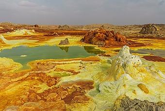 El lugar del Dallol se encuentra en la depresión de Danakil, una hendidura en el gigantesco valle del Rift, en Etiopía, a 120 metros bajo el nivel del mar y cerca de la frontera con Eritrea y Yibuti, así como del mar Rojo cuyas inundaciones y evaporaciones a lo largo de la historia han creado esta extensa planicie de sal, plástico e impermeable. Los idílicos colores que presentan las imágenes, dignos de la paleta de un pintor, donde se elevan curiosas chimeneas naturales, están más cerca de representar al infierno. Escasea el oxigeno y se pueden alcanzar temperaturas que superan los 100 grados.