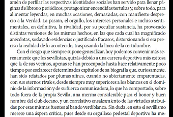 Con el riesgo que siempre supone generalizar, podemos convenir más serenamente que los sevillistas, quizás debido a una carrera deportiva más exitosa que la de sus vecinos, apenas se han preocupado, hasta hace relativamente poco tiempo, por esclarecer determinados capítulos de su biografía que, curiosamente, han sido relatados por plumas afines, cuando no abiertamente emparentadas, con sus eternos rivales, desde siempre muy superiores a los blancos en el dominio de la información y de su fuerza comunicadora, lo que ha comportado, sobre todo fuera de la propia Sevilla, una merma considerable para el honor y buen nombre del Club decano, y un correlativo ensalzamiento de las virtudes atribuidas por esas mismas fuentes al bando verdiblanco. Sin duda, en esto, el sevillismo merece una áspera crítica, pues desde su orgulloso pedestal deportivo, ha menospreciado la importancia de la propaganda, descuidando este frente, del que ha recibido, y sigue recibiendo, más heridas de las pertinentes.
