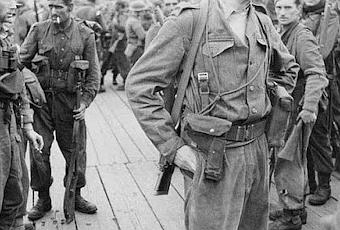 En playa azul las cosas no mejoraron para la Royal Regiment of Canada en su objetivo de tomar Puys y asaltar la playa que estaba presidida por un acantilado vertical. Un considerable retraso de las lanchas y dispersión de las mismas, hizo que la llegada a la playa fuera de día por lo que fueron repelidas con cierta facilidad sufriendo un gran número de bajas. El fracaso esta vez fue total y sus consecuencias nefastas. Este objetivo era clave para todo el desarrollo de la operación. Solo 2 oficiales y 63 soldados volvieron a Inglaterra. Los alemanes sufrieron dos muertos y 9 heridos.Mejor se dio en el flanco (playas naranja 1 y 2) gracias a los comandos del extravagante Lord Lovat (primera foto). Sus 250 hombres desembarcaron sin mayores problemas y capturaron la batería Hess. El único éxito de toda la operación.