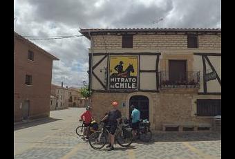 Unos cuantos del grupo cruzaron la calle con intención de comer en el bar de enfrente, mientras unos pocos nos quedamos tirando fotos al cartel del Nitrato de Chile que había en el mesón. También pinchamos en hueso porque no tenían para darnos de comer. Así que no nos quedó otra opción que apretar el culo y acercarnos hasta Covarrubias, a unos ocho kilómetros por carretera.
