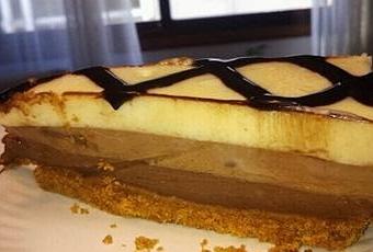 * Los mismos ingredientes para el chocolate con leche y para el chocolate blancoPrimero hacemos la base triturando las galletas y mezclandolas con la mantequilla formando una masa que pondremos en un molde desmoldable haciendo presión con los dedos para que quede bien prensada. Metemos el molde en la nevera hasta que lo volvamos a utilizar. Ponemos en un vaso los 75 cl de leche y disolvemos la cuajada removiendo enregicamente para que no queden grumos. Lo reservamos. En un cazo a fuego medio, ponemos a calentar la leche, la nata, el azucar y el chocolate negro previamente desmenuzado, removiendo sin parar hasta que empiece a hervir. En ese momento añadimos la cuajada que teníamos en el vaso y seguimos removiendo hasta que levante el hervor nuevamente. Entonces lo separamos del fuego y lo vertemos en el molde. Volvemos ha hacer lo mismo con el chocolate con leche. Esta vez, cuando lo vayamos a verter sobre el chocolate negro lo debemos hacer muy cuidadosamente para evitar que no se mezclen las capas. Yo utilizo un cucharón de sopa y lo voy echando muy despacio. Repetimos la operación con el chocolate blanco. Luego metemos la tarta en la nevera al menos ocho horas. Pasado ese tiempo desmoldamos y decoramos, en este caso yo utilice sirope de chocolate.