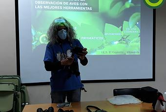 " aria-describedby="caption-attachment-2566" data-orig-size="4128,3096" sizes="(max-width: 4128px) 100vw, 4128px" aperture="aperture" />Momento del taller para profundizar en el uso de herramientas para observar aves en el IES El Espinillo
