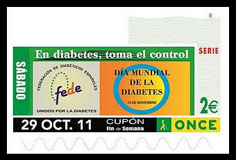 La ONCE dedica el Cupón de Fin de Semana del sábado 29 de octubre al Día Mundial de la Diabetes. Con esta iniciativa, la Organización se suma a los actos que conmemoran esta efeméride y que en España organiza, a nivel nacional, la Federación de Diabéticos Españoles (FEDE). Cinco millones de cupones llevarán la imagen del Día Mundial de la Diabetes.