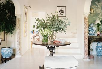 Recibidor en el centro; a la derecha, el comedor formal, de estilo clásico con toques orientales; a la izquierda, el salón, en estilo ecléctico, combinando muebles clásicos, orientales y estampados safari; al fondo, el espacio de cocina, office, aseo y estar, en estilo tradicional y mediterráneo; y subiendo la escalera, dos dormitorios, con una mezcla de estilo clásico y muebles orientales; un estudio, de estilo clásico; y un baño, de estilo inglés.