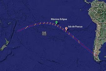 El máximo del eclipse se produce en pleno Océano Pacífico, con una duración de 5 minutos y 20 segundos, con el Sol a 47 grados sobre el horizontes a las 19:33 TU. Apenas cuarenta minutos después, la sombra atravesará la Isla de Pascua, destino de la mayoría de los observadores. Desde territorio europeo no se observa ninguna fase de parcialidad de este eclipse.