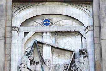 La fachada al canal muestra el uso del edificio mediante un gran grupo esculpido en bulto redondo, donde un comerciante observa como los operarios miden el peso de la mercancía. En los dos laterales también se observa una barroca muestra de pesas y balanzas. El arquitecto de la obra fue Pieter Post, el creador del barroco holandés.
