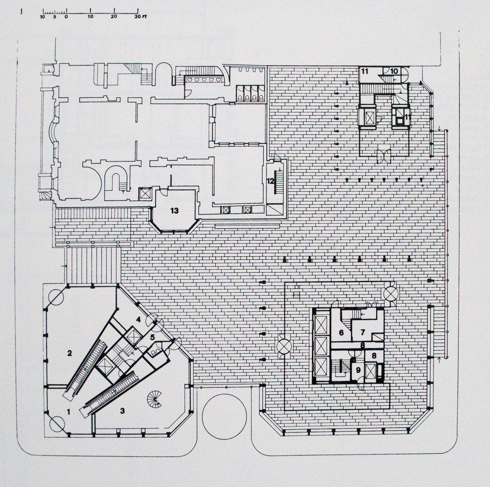 Las torres en lasesquinas impiden, también, las visiones diagonales. El espacio no se verá nuncaen verdadera magnitud: tampoco en ninguno de los edificios que lo rodean.Algunos de ello de calidad notable, por cierto. Y definen la calle a laperfección, sin alterar lo más mínimo la configuración urbana. Avanzandoacontecimientos las dos plantas inferiores del banco son ahora un restaurantejaponés. Éste niega completamente el acceso desde el espacio interior y lovolca a la calle. Tanto que la cocina queda perfectamente visible… contra elpatio de manzana. Los clientes se relacionan con St. James’s: la torreta haquedado segregada del resto de la intervención.