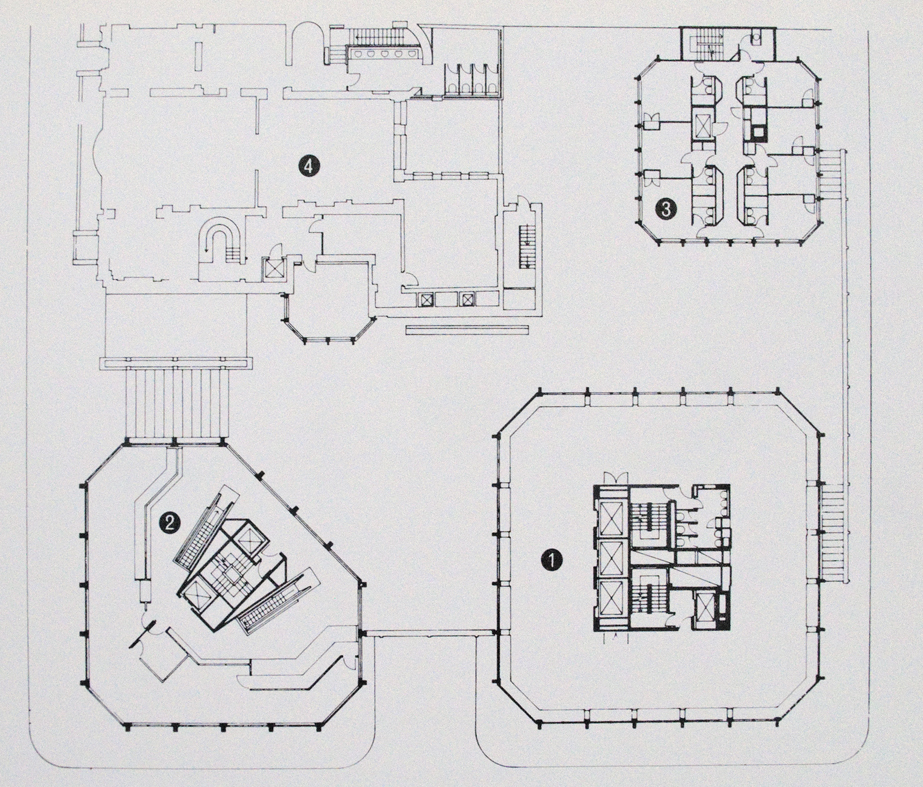 De entrada, el nombre:the Economist Building. El edificio Economist. En realidad cinco piezasdiferentes: una torre de cincuenta y tres metros en la esquina de Bury conRyder, una torre más pequeña sobre Bury, medianera con el edificio de al lado,un edificio difícil de clasificar en la esquina de St. James’s con Ryder, unaintervención en un edificio existente sobre St. James’s (el número 23), y elespacio libre entre ellos. Un espacio libre con grueso, muy complejo.1.- Torre de la redacción de The Economist. 2.- Martin's Bank. 3.- Torrecita de apartamentos del Boodle's Club. 3.- Boodle's Club, con su nueva tribuna hacia el espacio común.