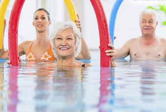 En el caso del ejercicio acuático las propiedades del agua hacen que este sea uno de los mejores ambientes para un programa de ejercicios. Se ha estudiado que tiene beneficios extra debido a los cambios en las propiedades biofísicas que facilitan la técnica como la flotabilidad, el gradiente de la presión hidrostática, la viscosidad, la temperatura del agua. La estimulación termal, táctil y la resistencia, pueden llevar a una mayor relajación, reducción de la sobrecarga articular, vasodilatación por calentamiento y analgesia. Se recomienda que el agua de la piscina este a una temperatura de más o menos 32º para que el paciente sienta mejoría.