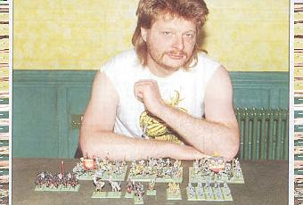Aunque no le doy ya desde hace años a WFB y mis Guerreros del Caos pillan polvo repartidos por casi de mis padres y de los padres de Kit,como van a salir en breves he pensado que esta entrada podría gustar.La foto de arriba es la foto mas conocida de Bryan Ansell,el segundo propietario de GW tras sus fundadores y creador de Asgaard,Citadel y Foundry entre otras marcas de miniaturas.Es un ejercito de tercera edición de WFB(Hacia finales de los 80) y siempre querido ver las minis con mas detalle y de que se componía el ejercito en si.Bueno,pues buscando por la red di con el Warhammer Armies ,de 1988 donde sale el ejercito detallado,incluida la lista.Curioso como eran las listas de ejercito entonces,no?Pinchar para ver mas grande.