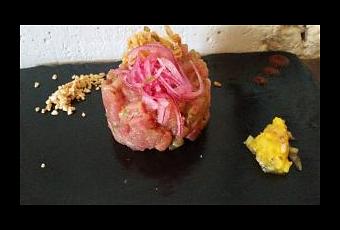 Emplatado estructurado de Tartar de atún, La Dominga restaurante en Malasaña