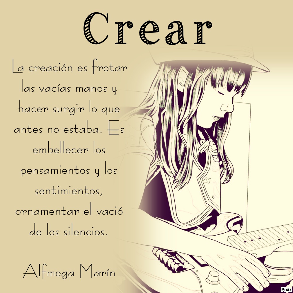 No, crear es frotar las manos vacías y hacer surgir lo que antes no estaba; es embellecer los pensamientos y los sentimientos y ornamentar el vació de los silencios.