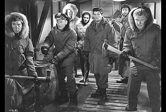 The thing… from another world (Christian Nyby & Howard Hawks, 1951. EEUU): modesto (como todo el cine fantástico de la época) aunque apreciable-pese a que el tiempo la ha tratado de forma harto injusta- film de ciencia-ficción, una propuesta interesante, sin pasarse, dentro del extremadamente interesante panorama fantástico de los años 50, sustentado en esa propia “economía de medios” con la cual se denomina (y se alaba) a las sci-fi moviesde ese tiempo y el cual John Carpenter remodeló a su imagen y semejanza (aquí el ser alienígena es una especie de remedo del monstruo de Frankenstein torpe a más no poder) en su notable y superior versión de 1982, alejándose una barbaridad del original y donde el énfasis recaía en los efectos y en el gore. Aparentemente Hawks sólo produjo, cediendo la responsabilidad final a uno de sus montadores habituales, aunque no es difícil imaginar que el director de Centauros del desierto (The searchers, 1956) tuviera cuarto y mitad de la culpa del eficaz aunque normalito resultado del film.