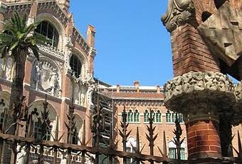 Si todavía quedan fuerzas y no ha sido suficiente éxtasis la visita a la Sagrada Familiarecomendamos tomar desde allí mismo la “Avinguda de Gaudi”, donde hay cafés y bares a la sombra para descansar y reponer fuerzas y así llegar hasta el último lugar que recomendamos para terminar nuestra visita al ENSANCHE: EL HOPSITAL DE LA SANTA CREU i DE SANT PAU, cuya entrada está justamente alineada hacia el templo de la Sagrada Familia.Al pasear por los jardines de este lugar nuestra soñadora imaginación nos pone en las antípodas del concepto que se tiene de un hospital: un sitio lúgubre, triste, monocromo. Caminar en Sant Pau es como meterse a andar por un pequeño reino lleno de mini palacios al cual más bello. Todo eso se condice con la idea que tenía el creador de este lugar, el arquitecto Domenech i Montaner para quien el arte, el color, la naturaleza, el aire libre, eran poseedores de virtudes terapéuticas. De ahí que los pabellones y la recepción estén tan profusamente decorados con murales de mosaicos y esculturas y los tejados y torres cubiertos de coloridas cerámicas. Y para no alterar este estado de paz que los enfermos tenían al pasear por los inmensos jardines se hizo bajo los pabellones del hospital una inmensa red de subterráneos por donde caminan personal médico y vehículos. La construcción de este nosocomio duró 30 años y fue subvencionada por el rico banquero Pau Gil, de allí el nombre de Sant Pau (Pablo) e inaugurado por el rey Alfonso XIII.