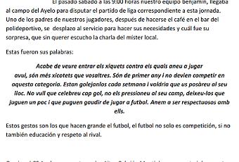 ...El padre de uno de los jugadores del CD Contestano escuchó accidentalmente desde el baño las palabras que el entrenador del CF Aielo, Aitor Cebrian, dedicó a sus pupilos antes del partido:“Acabo de ver entrar a los chicos contra los que vais a jugar. Son más pequeños que vosotros. Son de primer año y no deberían estar compitiendo contra vosotros. Todas las semanas los están goleando y me gustaría que os pusierais en su lugar. No quiero que celebréis ningún gol, no les presionéis arriba, dejadlos jugar un poco y que puedan disfrutar de jugar a fútbol. Seamos respetuoso con ellos”