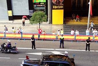 Las imágenes hablan por si solas, la proclamación del nuevo rey ha despertado un entusiasmo inusitado, cientos, no, miles, no millones de españoles llenaban las principales vías por donde iba a pasar la comitiva. Los miles de policías se sentían desbordados ante tal avalancha de gente, los pobres no sabían si emplearse a fondo con las porras para intentar a los sumisos vasallos de los nuevos reyes o descargar su frustración y rabia contras los escasos disidentes que se atrevían a ejercer como ciudadanos. Vamos, ambientazo a tope, un éxito total. La excelentísima del "relaxing cup the café con leche in de plaza Mayor", Ana Botella, incluso había copiado el estilo nazi y fascista para adornar calles y ayuntamiento, sobre todo el ayuntamiento, de hecho la procesión parecía copiada de la entrada de Hitler en Paris, con las SS como únicos espectadores. Fue tal el entusiasmo de la más inepta de las alcaldesas de Madrid que terminó agotando las existencias del los viveros municipales y privados para llenar el recorrido de flores, cambiado los bancos de las calles, levantado adoquines, colocando kilómetros y kilómetros de banderas monárquicas durante el recorrido, agotando hasta las banderas "made in china"de los chinos, repartidas entre turistas japoneses, policías de paisano, jubilados y hasta mendigos reclutados para que hiciesen bulto. Han perseguido, golpeado y maltratado a aquellos ciudadanos que llevaban banderas republicanas, incluso han apaleado a algunos por gritar ¡Viva la República! , en fin el árbol que siempre ha tenido las raíces podridas está tocado de una grave enfermedad, la indiferencia, sóle falta que los ciudadanos tengamos la dignidad de arrancarlo para siempre de nuestro país. Porque si si no hubiese sido por los turistas, muchos de ellos japoneses, las calles habrán parecido las de Pinarejo a la hora de la siesta, eso a pesar de que era gratis y festivo.