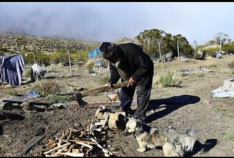 A metros de la Ruta Nº 237, Argentino Libertador Aranea pasa sus días sin luz, radio ni celular.Una semana atrás se incendió su casilla y manos solidarias le acercan comida y agua. Cuenta una leyenda que se quedó ahí tras perder a su familia en un accidente.
