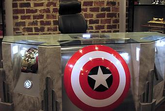 Es espectacular y aunque paresca mentira y es la idea de un fanático del Capitan America que diseñó tu propio escritorio de su sueño.El escritorio es totalmente personalizado y fue subastado luego de que la idea tuviera buena repercusión, todo una pieza coleccionable y si de ideas locas se trata este escritorio con los superheroes de Avengers se llevó los aplausos. Viene equipado con todo, desde decoraciones y estantes donde posan un casco y un famoso martillo y hasta cajones y escondites para guardar lo que sea. Mas información Tomspinadesigns