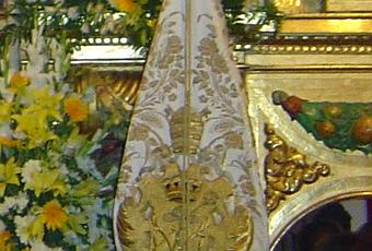 En 1998 la primera junta de gobierno democrática de la hermandad de la Divina Pastora, salida de las primeras elecciones convocadas tras la aprobación definitiva de las nuevas reglas y encabezada por Antonio Castaño Villalón, acordó en cabildo de oficiales, sustituir el tejido de esta insignia por uno más apropiado a la idiosincrasia y estética pastoreña, y se pasó el bordado a un brocado de seda, de estética decimonónica, blanco y oro, con ornamentación de espigas uvas y rosas y con forro de moaré celeste, como podemos contemplarlo actualmente.