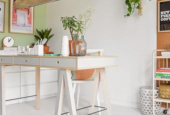 Y ahora nos detenemos junto a la pared forrada con corcho creando un enorme pinboard, que se completa con un carrito muy práctico para dejar los archivadores, carpetas.......y una papelera de Ikea.