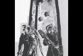 La puerta ha demostrado ser más resistente de lo que había pensado originalmente, y no fue hasta varios días después que pudimos practicar una entrada. Una vez dentro, descubrimos un destrozado elevador en un pozo que descendía en las profundidades de la montaña y nos vimos obligados a preparar un arnés de cables, ya que parecía que el ascensor ya no era operativo. El hermano Lequara fue el primero en descender en el arnés y pronto desapareció en la oscuridad del pozo. Me di cuenta que las marcas en sus paredes, lo que yo había tomado en primera instancia como daños por la corrosión, eran de hecho, impactos láser y de armas de fuego pequeño calibre. Brevemente me pregunte qué acontecimientos transcurrieron aquí, pero estos pensamientos fueron rápidamente olvidados al imaginar los secretos que podría descubrir en este pico abandonado. Por un momento incluso tuve esperanza encontrar un sistema STC en pleno funcionamiento!
