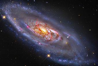 ¿Qué está pasando en el centro de la galaxia espiral M106? El aspecto de M106, un disco giratorio de estrellas y de gas, está dominado por los brazos azules en espiral y las bandas de polvo de color rojo cerca del núcleo, como muestra la imagen.