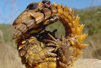 Este singular reptil habita el sur de África. Su sistema defensivo es peculiar, adopta una forma de anillo, girando su cuerpo en el eje sagital hasta morderse la cola, exponiendo sus escamas y gruesas espinas.