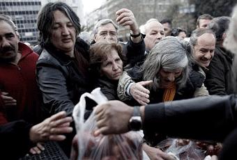 Las personas de la imagen somos nosotros. Nadie mira a cámara, nadie sonríe ante el regalo porque nadie les está regalando nada, más allá de los agricultores que reparten frutas y verduras en una plaza griega. Al contrario, les han robado su futuro. A estas personas les da igual la presencia del fotógrafo de una agencia internacional y que sus caras se publiquen en cualquier rincón del mundo. Hay hambre y hacen bien en no tener vergüenza por ello. Estas caras no nos son ajenas: la foto podría haberse tomado en cualquier plaza española. Pero preferimos enfocar lejos y reflejar la desgracia ajena. Es el miedo a quemarnos los ojos con imágenes demasiado cercanas. El miedo cotiza alto y ahora es el momento de deshacerse de él. Sólo así ganaremos.