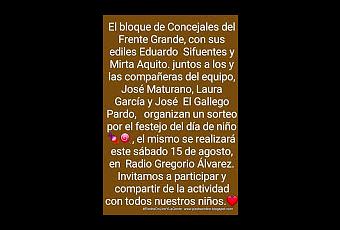 Una publicación dejo ver el modo en que el Frente Grande, (el nuevo Bloque que suplanto en el Concejo Deliberante a Democracia Cristiana de Jorge Sobisch) festejará el Día del NiñoPiedra del Águila.- Aquito y Sifuentes dejaron circular en Facebook, que el Frente Grande de Piedra del Águila realizará un sorteo en radio Gregorio Alvarez un día antes del Día del Niño. Del mismo participaran integrantes que pertenecieron en su momento a las filas de Adólfo Paine, Maturano, García y Pardo. No existiendo mayores explicaciones, sobre el horario a realizarse ni cuales serían los premios.