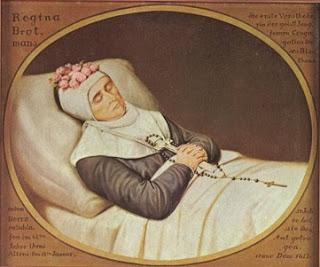 "El fuego de la caridad cristiana ardía en su corazón. ¡Los pobres y los necesitados pueden hablar de esto! Cuántas veces no lavaba los pies de los pobres en la casa anfitriona, cuántas veces no limpiaba las heridas de los pacientes. ¿Tenía alguien fiebre, dolor de muelas, hinchazón, una enfermedad ocular o lo que fuera?, pues ella sabía un medio para ello. Si se enteraba que alguien estaba enfermo, aunque fuera una persona completamente desconocida enviaba allí a una hermana con una sopa confortante y una comida sólida para fortalecerle.Regina subió al encuentro con el Esposo Cristo el 18 de enero de 1613, luego de pasar toda la Navidad enferma. Su culto siempre fue reducido, pero su ejemplo animó a muchos a hacer el bien y trabajar por Cristo. Sus reliquias se veneran en Grottaferrata desde el siglo XX. Fue beatificada por San Juan Pablo II el 13 de junio de 1999.A 18 de enero además se celebra aDesde hace más de cuarenta años dirige a las Hermanas Catarinas. Ella es un ejemplo para todas sus hermanas. Se impone a sí misma las mortificaciones más estrictas, que prohíbe a sus hermanas. A menudo ella regala su ropa o ropa de cama, duerme en el piso desnudo o pasa la noche rezando ante el Sacramento por la conversión de los pecadores. Cuando escucha que la guerra o un conflicto armado estalla en algún lugar comienza una oración de cuarenta horas con su comunidad, como si sólo ellas fueran capaces de evitar la calamidad. Insistentemente va hacia su meta a pesar de las decepciones y contratiempos, inspirada por su lema de vida 'Como Dios quiera'".
