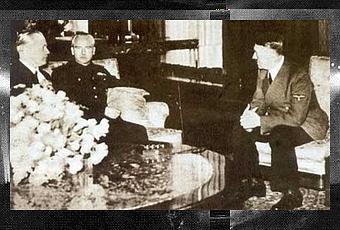 Serraño Súñer (en el centro) con altos dirigentes alemanes durante su visita al Reich. A la izquierda, con gafas, Heinrich Himmler.El Ministro de Interior y Asuntos Exteriores de España, Ramón Serrano Suñer, llegó a Alemania el pasado día 13 acompañado de una serie de personalidades españolas inclinadas en favor del Nacionalsocialismo. Ramón Serrano ha tenido ocasión de reunirse hoy con el Führer, quien ha discutido con él la posibilidad de que España se acerque a la órbita del Reich. El Führer ha propuesto a Serrano Suñer que España colabore con Alemania en la construcción de “un frente común que discurra desde el Cabo Norte hasta Marruecos.” El Führer prepara al continente para una larga guerra de asedio contra la plutocracia inglesa.