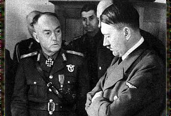 El Führer y el Conducator conversan tras la entrega de la condecoración que Antonescu luce en el cuello.Con ocasión de la liberación de Besarabia, el Führer y Comandante Supremo ha otorgado al Jefe de Estado Rumano y Comandante Supremo de las tropas rumanas, General Antonescu, la Cruz de Caballero de la Cruz de Hierro. El Führer ha entregado la condecoración personalmente en el frente sur del teatro de guerra del Este.