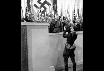 Un cámara retrata al Führer en el momento en que se sube a la tribuna de oradores.